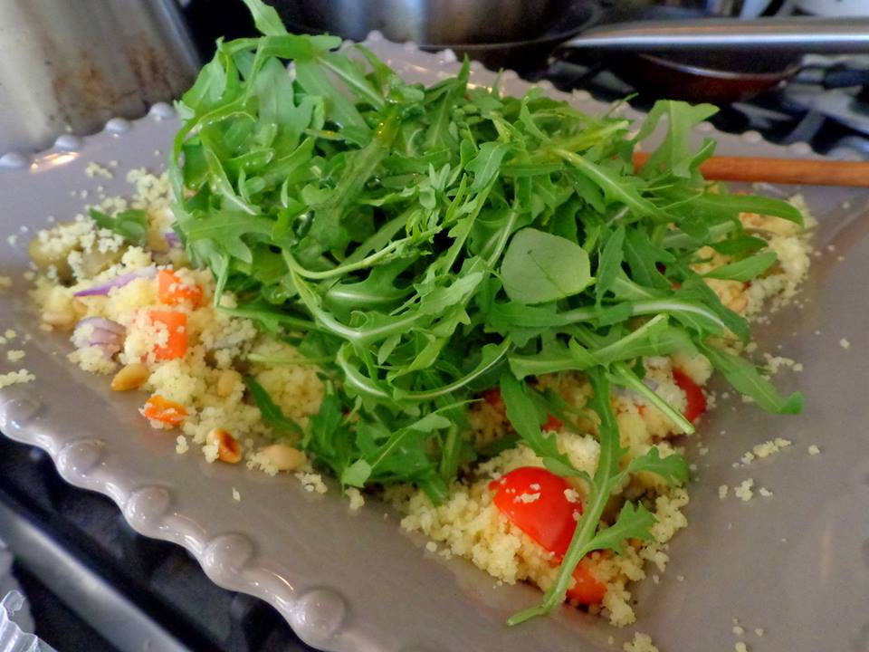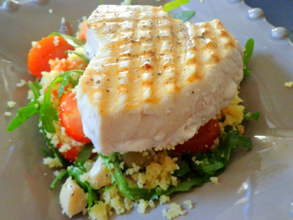 2. Move the cous cous to a big plate/bowl when it’s done. Cut the cherry tomatoes into half, add the carrots and tomatoes to the cous cous. Also cut the onion into small pieces and slice the goat cheese. Roast the pine nuts and also add them to the plate. Season the pangafilet or tuna steaks with salt and pepper, grill them for a few minutes.
