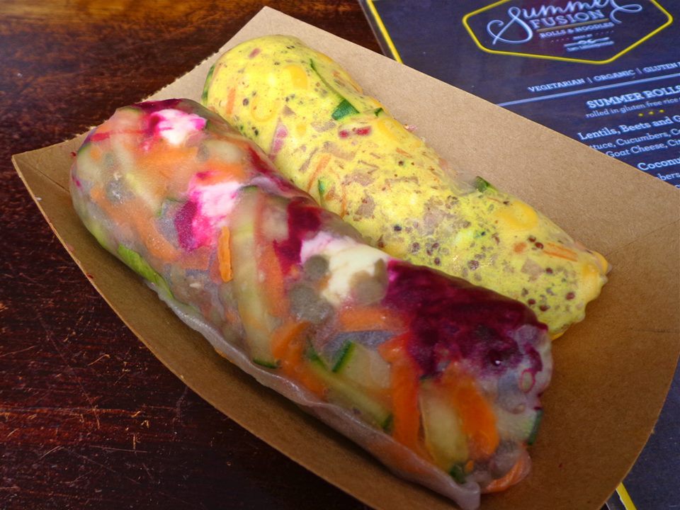 Summer rolls! One includes goat cheese, lentils and beets. The other one has corn, coconut and curry!