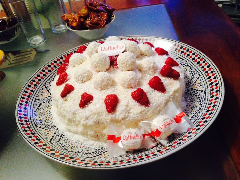 4. When the layers are covered, spread the whole surface of the cake with the melted white chocolate. Add the coconut flakes on the cake. Decorate your cake with the Raffaello choclates and strawberries.