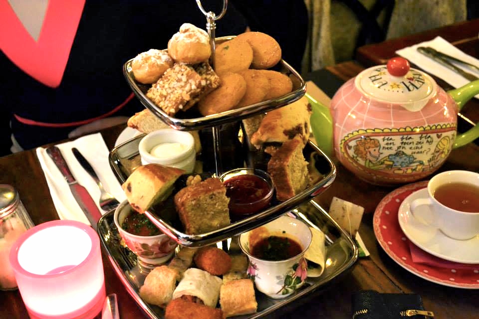 The high tea normally costs 17, 50 euro’s, so it is quite a good price. The time is from 2:30 pm to 5 pm. For this price you get a lot of tea in cute tea pots and tea cups and a wide variety of tea, goat cheese croquette from grandma Bob, roasted tomato and paprika soup, quiche, scones with fruitjam and clotted cream, banana bread, cream puffs, chocolate nut cake and buttercream cookies.